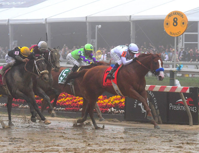While it is common to modify photos in the computer, typically one does so in an attempt to produce an end product which reproduces, as closely as possible, the photographer's recollection of the reality of the moment when the photo was taken. In the case of this year's Preakness, shooting conditions were such that reality was so foggy, color so muted, that the pictures would be essentially all hazed and shrouded in a grey mist. Therefore, many of the photos in this particular blog are significantly color enhanced in order to make them of interest. I have attempted to reproduce color which bears in mind the colors which might seen in more advantageous lighting circumstances. In other words, what we see in many of these pictures in this sure wasn't what was being seen on the track that day! I have inserted several unaltered photos for comparison. MDW
